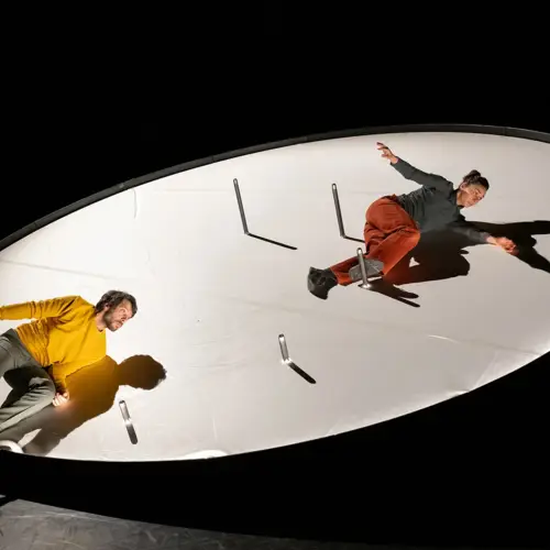 Au centre de la scène trône un agrès spectaculaire : un plan incliné de six mètres de diamètre qui bascule, pivote et tourne. C’est dans l’instabilité de cette scène en mouvement que se joue la rencontre chorégraphique oblique entre Jonathan Guichard et Lauren Bolze, les deux jeunes créateurs de la compagnie circassienne H.M.G. Inspirés du mythe de l’androgyne et la naissance du sentiment amoureux, ils semblent courir l’un avec l’autre, dans l’étonnement constant de ce déséquilibre. Chutes amorties et courses ascensionnelles sans fin rythment leurs déplacements quasi irréels, dans un état de corps ouaté, presque au ralenti. Se dessine aussi une variation pleine de grâce autour de ce Thaumazein qui leur sert de titre et nomme, en grec ancien, notre capacité d’étonnement fécond face à une situation inattendue. Nous voilà, nous aussi, foudroyé·es d’émerveillement et constamment surpris·es