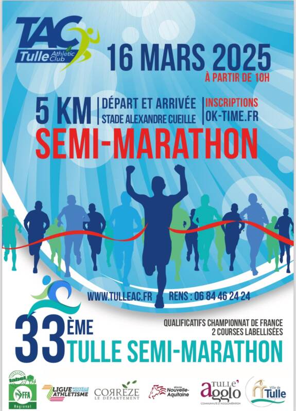 Le Tulle Athlétique Club organise sur un nouveau parcours, son 33ᵉ semi-marathon dans les rues de Tulle et la vallée de la Corrèze. En complément à cette course, nous vous proposons un nouveau 5 km du printemps. Ces épreuves à label régional sont qualificatives pour les championnats de France de semi-marathon et de 5 km. Les départs seront donnés simultanément à 10h, place Marcel Paul à l’entrée du stade Alexandre Cueille à Tulle. Les arrivées se feront sur la piste d’athlétisme. Parcours : plat et rapide Semi-marathon : Le semi prendra la direction du centre-ville jusqu’au pont de la Barrière et retour vers le stade puis un aller et retour sur une petite route de campagne le long de la rivière Corrèze et arrivée au stade. Course à partir de la catégorie junior. 5 km du Printemps : Le 5 km du printemps partira à l’opposé du semi dans la vallée jusqu’au lieu-dit la Cible