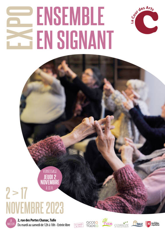 L'exposition "Ensemble en signant" répond à une commande passée par le CCAS de Tulle à l'artiste photographe Mathilde Fraysse. Cette opération vise à rompre l'isolement des personnes par la sensibilisation à la Langue Des Signes française (avec Mélanie Crozat). Ce projet -intergénérationnel- a donné lieu à plusieurs ateliers d’initiation (pour les agent.e.s du CCAS et de son chantier d’insertion, les agent.e.s municipaux en fonction d’accueil, les agent.e.s du service scolaire-jeunesse, les résident.e.s de la Résidence autonomie, les personnes âgées et/ou isolées et les enfants du Centre de Loisirs du Chambon. Il a aussi permis la tenue d’ateliers d’écriture (animés par Françoise Hachani), mais aussi d'arts plastiques via des ateliers de photographie. Ce projet a aussi donné lieu à une rencontre entre les résident.e.s de la Résidence de Nacre et les élèves de l’école Turgot