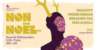 Pour clore en beauté 2024, déjà bien chargé en décibels, Elizabeth My Dear vous propose son embûche Noël, concoctée avec la crème de la scène limousine. Maloutt tout en subtilité nous mettra en appétit, suivie par le bien connu Moustique qui montrera, en solo, qu'il n'a rien perdu de son piquent. Ema Alkala se fers fort de justifier son statut d'étoile (du Berger ?) montante avant que le punk aussi mélodique qu'énergique de Breaking Tag fasse souffler un vent de Californie sur notre fin de soirée. Jamais tel festin n'aura été digeste... Tarif : 10 € coupe offerte