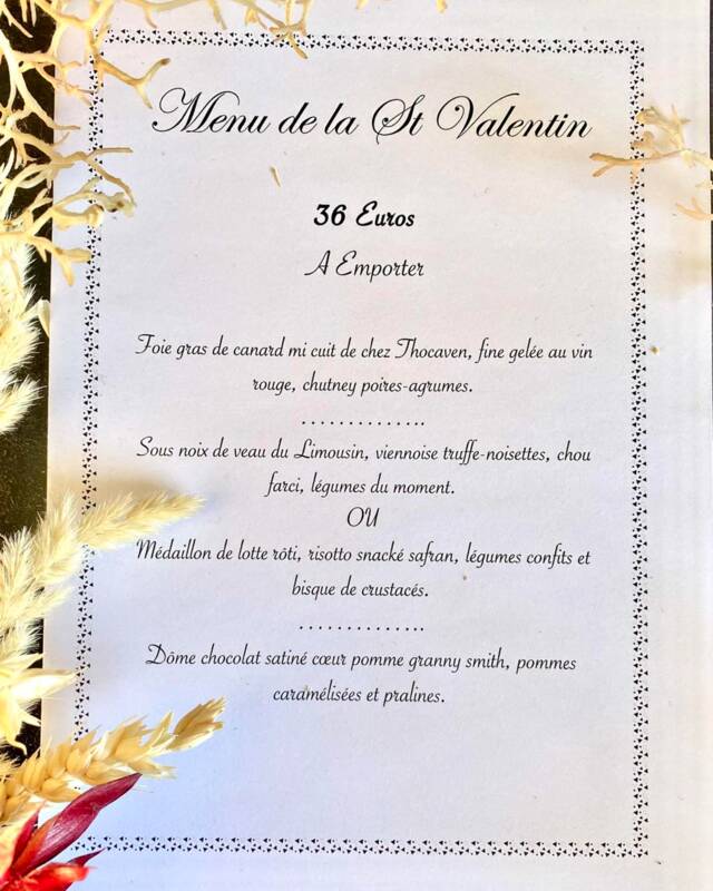 Menu de la Saint-Valentin - À emporter - Foie gras de canard mi-cuit de chez Thocaven, fine gelée au vin rouge, chutney poires agrumes - Sous noix de veau du Limousin viennoise truffe noisettes, chou farci, légumes du moment ou Médaillon de lotte rôti, risotto snacké safran, légumes confits et bisque de crustacés Dôme chocolat satiné cœur pomme granny-smith, pommes caramélisées et pralines. - Tarif : 36 € - Les commandes sont à récupérer le vendredi 14 entre 16 h et 18 h 30. Dans la limite des quantités.