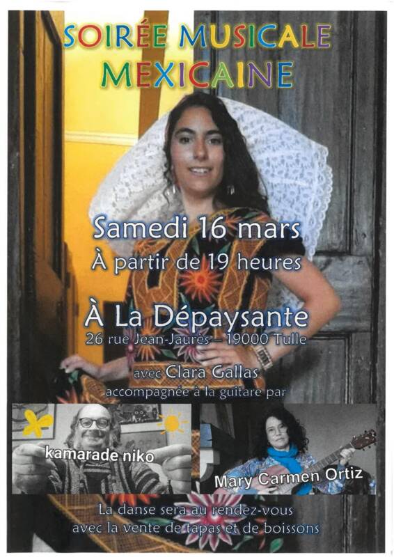 Soirée musicale mexicaine avec Clara Gallas accompagnée à la guitare par Kamarade niko et Mary Carmen Ortiz - La danse sera au rendez-vous avec la vente de tapas et de boissons -