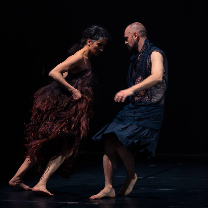 Peut-on s’aimer et se déchirer, voire s’entretuer dans le même temps ? Puisant dans les histoires d’amour tragiques d’Orphée et Eurydice – où un seul regard vers l’aimée suffit à la condamner –, de Tancrède et Clorinde – idylle impossible entre un croisé et une Sarrasine –, Rosalba Torres Guerrero et Koen Augustijnen, figures phares de la danse belge, chorégraphient un duo aux engagements physiques intenses. Les corps à corps douloureux et rapprochements charnels illuminent les partitions de Claudio Monteverdi : son Orfeo mythique, considéré comme l’un des tout premiers opéras jamais écrits, et son Combattimento di Tancredi e Clorinda, alternant fracas des armes et douceur des étreintes. Ici, l’adaptation musicale se réduit à un cercle très intime : deux accordéonistes, Philippe Thuriot et Gwen Cresens, une soprano et un ténor, vibrant à l’unisson de ces déchirantes amours condamnées.