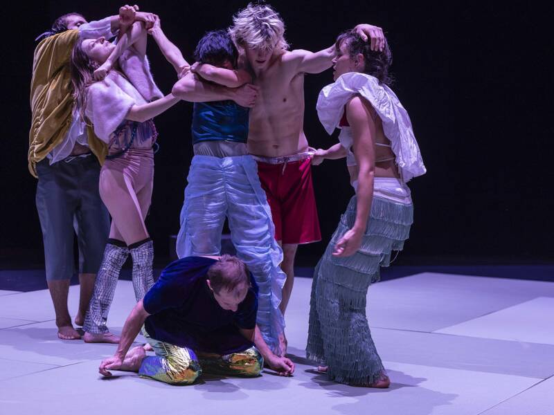 D’abord, il y a l’espace. Vingt-cinq tatamis vert pâle dessinent une forme géométrique irrégulière, sur laquelle s’inscrivent les trajectoires, vrilles, roulé et suspens de six danseurs passagers. Empire est une aire de jeu autant qu’un état d’esprit, une tentative plastique et chorégraphique de déjouer l’autorité, à plusieurs. Le judo et la contredanse anglaise, alliés incongrus de la Zampa pour cette nouvelle création, impriment les gestes, ralentissent les tombées, ajustent les contacts, troublent les lignes. Sur la pulsation sourde des guitares loopées et grattées de Marc Sens, complice fidèle, ce flux continu de corps aux couleurs nacrées se teinte de brillance, de collerettes et couronnes fleuries au fur et à mesure que la danse s’électrise. La Zampa (La Belle Humeur, Bleu) avance dans une de ses plus lumineuses partitions collectives.