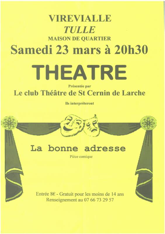 Théâtre présenté par le club de théâtre de St Cernin de Larche. Ils interpréteront "La bonne adresse - Pièce comique - Entrée : 8 € - Gratuit pour les moins de 14 ans -