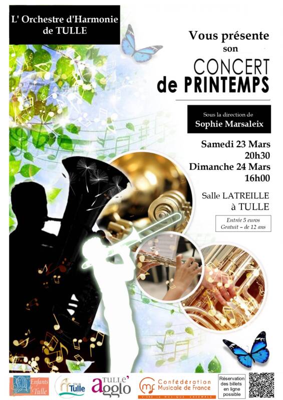 L'harmonie est un ensemble composé de 60 musiciens, nous allons proposer un programme varié qui plaira à toute la famille ! . Entrée : 5 € et gratuit - 10 ans - Billetterie : https://societe-musicale-les-enfants-de-tulle.assoconnect.com/collect/description/396517-q-concert-de-printemps-de-l-harmonie-de-tulle