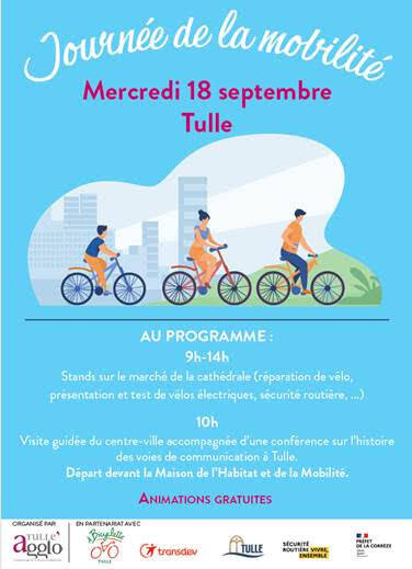 De 9h à 14h, marché de la cathédrale à Tulle : stands Mobilité (réparation de vélo, présentation et test de vélos électriques sur les collines tullistes, etc.) - À 10h, à la Maison de l’Habitat et de la Mobilité) : visite guidée du centre-ville accompagnée d’une conférence sur l’histoire des voies de communications à Tulle. Animée par Pierre Courteix des archives municipales de la Ville de Tulle.
