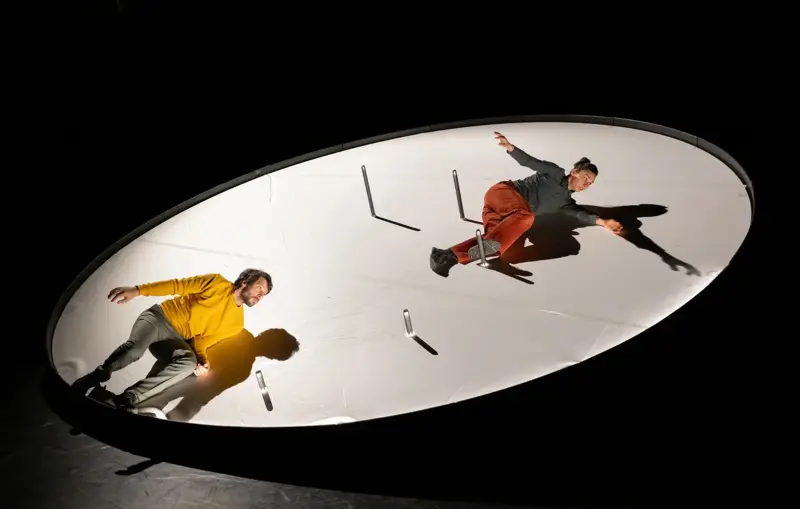 Au centre de la scène trône un agrès spectaculaire : un plan incliné de six mètres de diamètre qui bascule, pivote et tourne. C’est dans l’instabilité de cette scène en mouvement que se joue la rencontre chorégraphique oblique entre Jonathan Guichard et Lauren Bolze, les deux jeunes créateurs de la compagnie circassienne H.M.G.